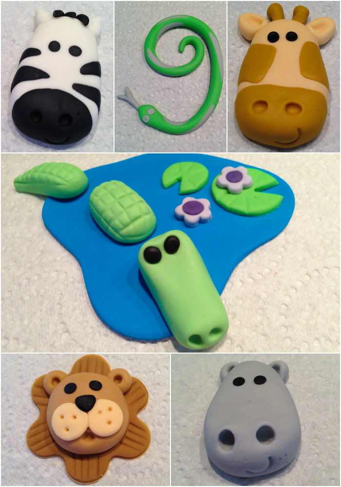 A while ago I offered to make some fondant decorations for a friend to put on her daughters’ birthday cake. There were only two days to go until her party so I said nothing too big that would take a long time to make and dry. Her first thoughts were athletics and gymnastics, which scared me when I imagined making little people in a rush. But then she told me her daughter also loved jungle animals, so we went with that theme – much easier to make animals than people!