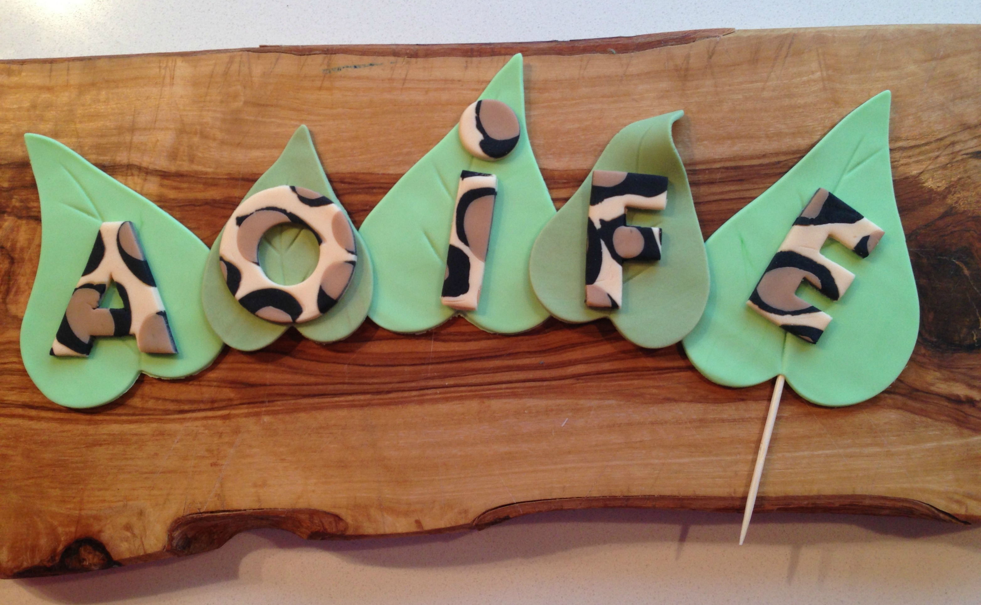 I had a look around pinterest and decided on some very cute three dimensional animal faces and some leaves. I also made leopard print letters to spell out the birthday girls name. For the animal print I found some great instructions at taste.com. They also did zebra and giraffe print. I guess the only problem with this technique is the waste factor, because if you roll out the fondant a second time all the colours mix together to make a yucky brown goo!