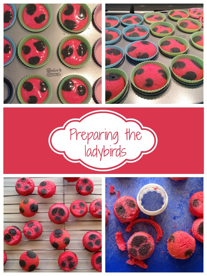 I have to admit this was a bit of a painstaking process – I spent the whole morning baking! The aim was to make a surprise inside cake, with hidden round red ‘ladybirds’, complete with black spots. I had been inspired by some amazing photos on pinterest, and just had to have a go at it myself. So with my nieces second birthday on the horizon I decided to take on the challenge.
