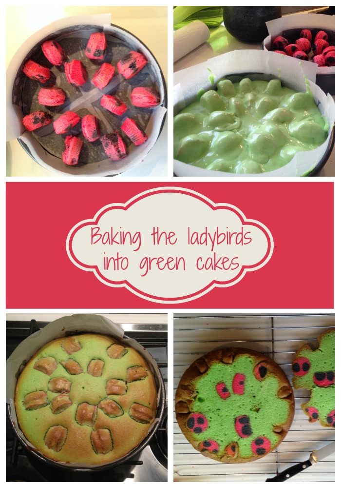 Anyhoo, I prepared the cake tins, arranged the ladybird cupcakes and carefully spooned some green cake mixture over the top. I wasn’t sure how much to add, but kept going until there was green between all the red cupcakes, and a layer over the tops as well. You could still see the mounds of the hidden cupcakes beneath. Unfortunately, some of the ladybirds moved during baking. Some just rose slightly in the mix, but others rolled over as well. So when we cut into the cake they might not look like circles any more, but more like rectangles I guess. Oh well, I really can’t be bothered starting over, so this will be the cake my niece gets on the weekend. I think next time, if I ever bake this cake again, I’ll buy a cake pop mould – it would cut out soooo many steps and make the whole process a LOT easier! And while I’m trying not to spend too much money at the moment, there are a whole lot of other things I could have got done today while the kids were at school!!