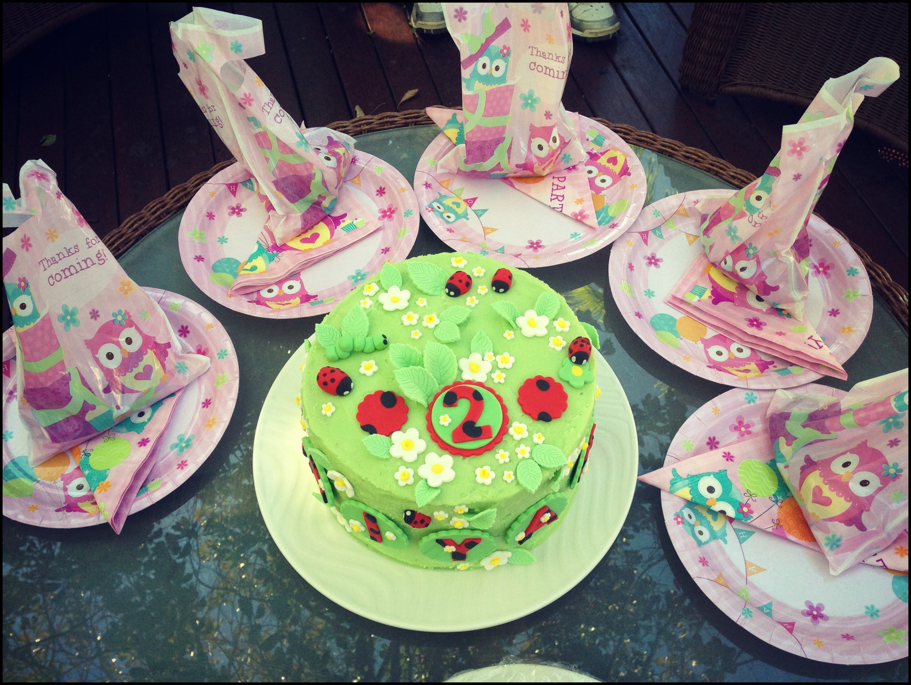 We travelled to Broome by plane, which was an interesting way to get a cake to a party! I double wrapped then froze the layers of the cake once they were cool to give it a better chance of surviving transportation. I also didn’t think I’d be able to successfully whip up a batch of buttercream icing in our accommodation, so I made it at home the night before we left, and refrigerated it until it was hard as a rock! I put it all in an insulated bag with freezer bricks, and off we went. Thankfully it all made it to Broome in one piece – well three pieces actually, but that was the way it was meant to be! Luckily we were the first to arrive, so I had time to put it all together ready to surprise the birthday girl. The kids were all very excited about the cake and the party away from home. I’m not sure that the hooty owl plates really went with the ladybird theme, but that’s what happens when you forget to organise party decor!!